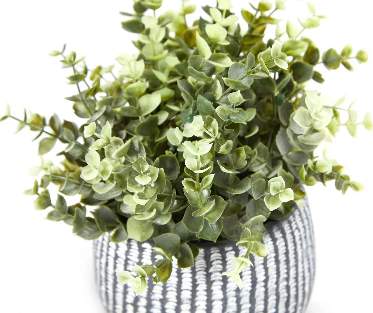 Add gorgeous greenery to your space without the upkeep using this artificial plant! Realistic Eucalyptus leaves are featured within a round cement pot accented with white dash lines. This maintenance-free plant is a lovely addition to a mantel, table or shelf.