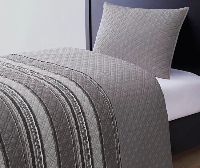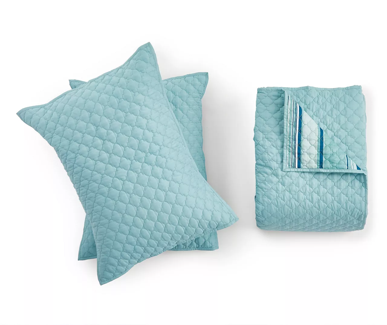 Create two looks in one with this reversible bedding set! Featuring a quilt and sham in a beautiful aqua palette, it lets you choose between a solid look or stripes.